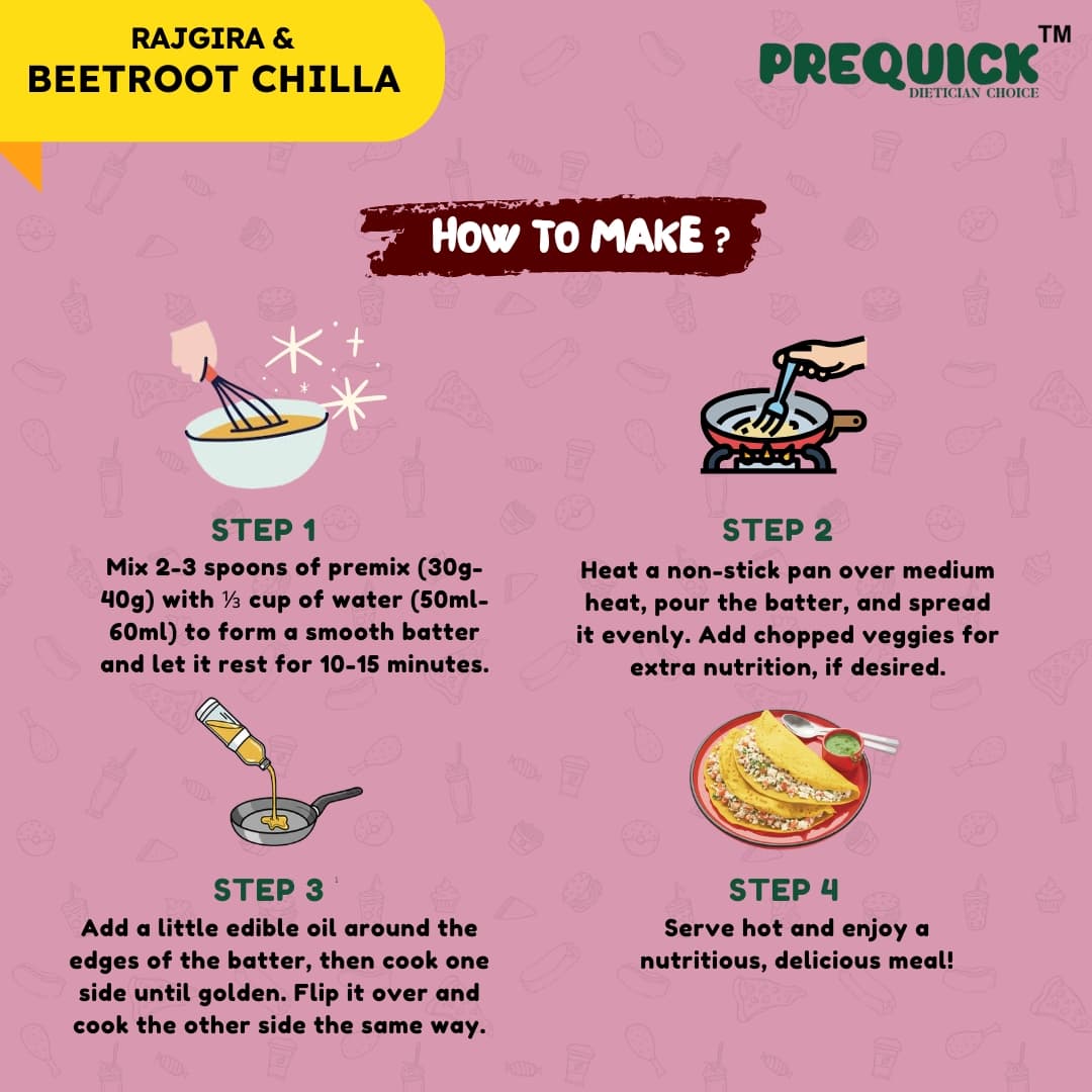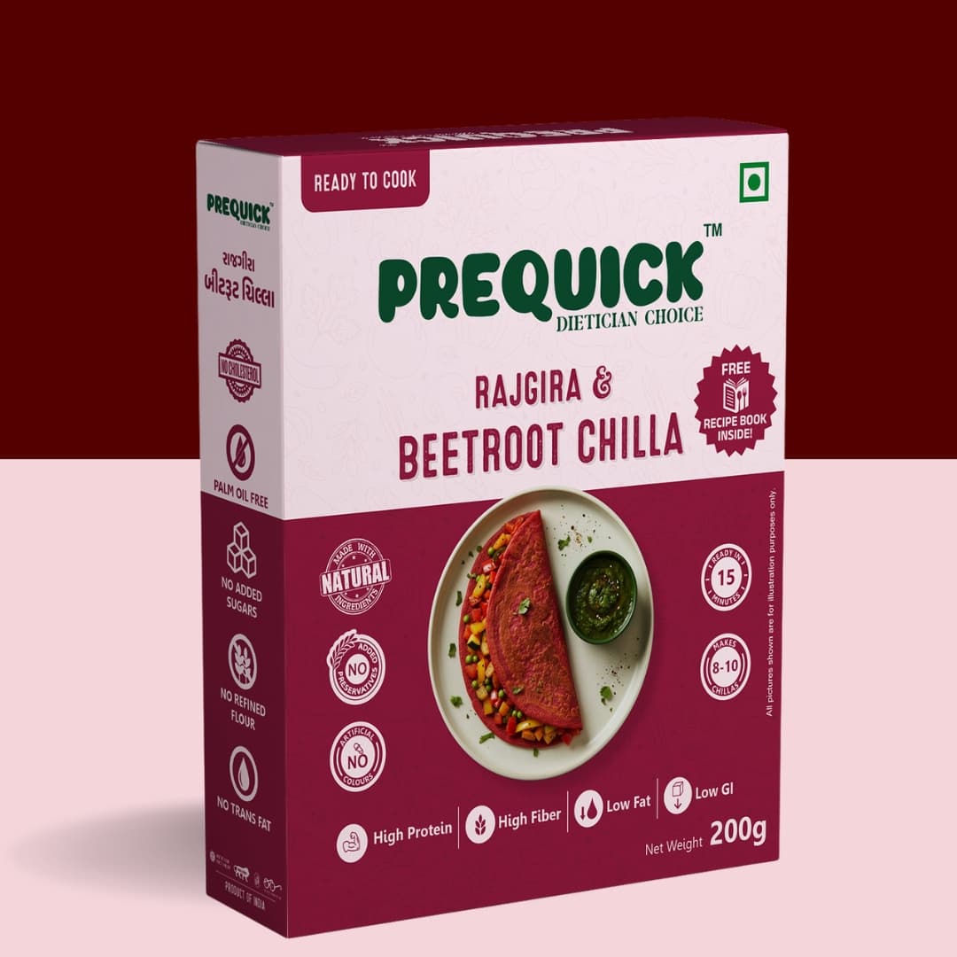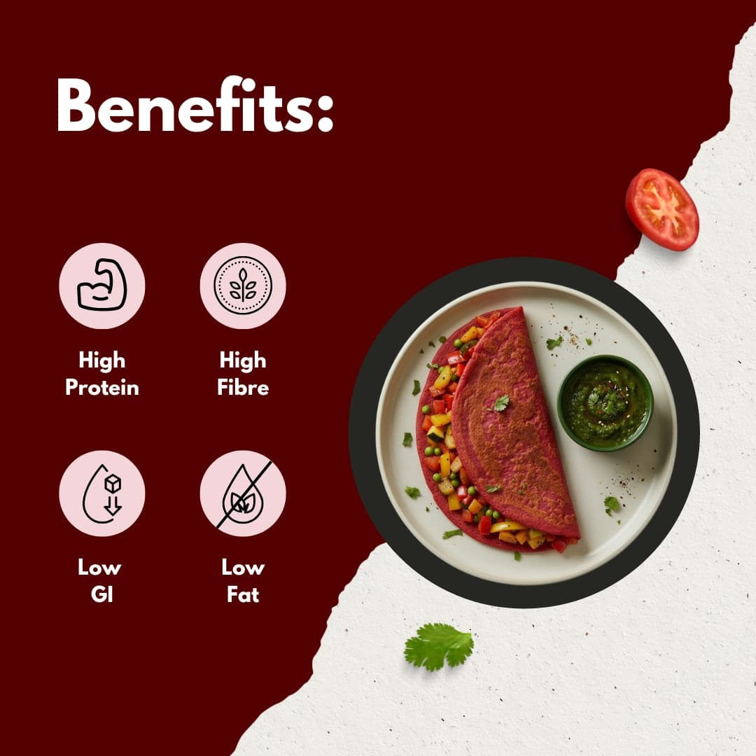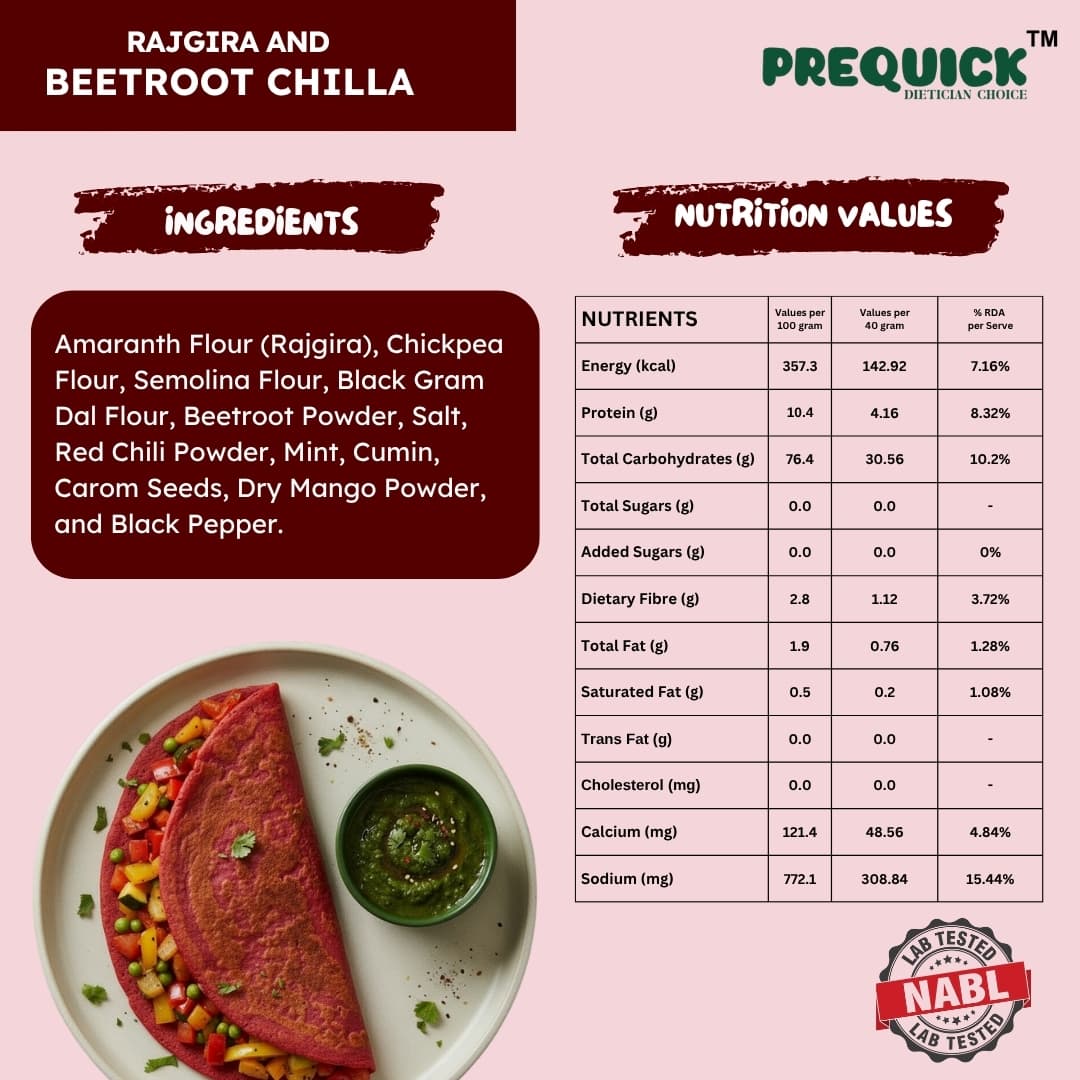 Amaranth Flour (Rajgira), Chickpea Flour, Semolina, Black Gram Flour, Beetroot Powder, Salt, Red Chilli Powder, Mint, Cumin, Carom Seeds, Dry Mango Powder, and Black Pepper.